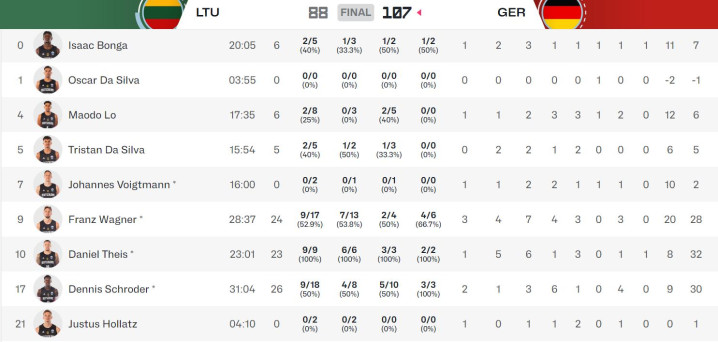 赛后统计:德国队这边小黑施罗德得到26分6助攻4抢断,小瓦格纳24分7板,泰斯23分,三东谈主合砍73分;立陶宛这边瓦兰仅得14分,乔库拜蒂斯得到20分7助攻。