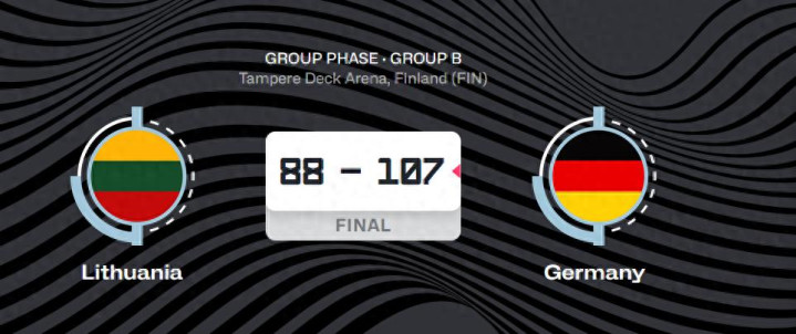 本场比赛事后,B组积分榜德国3连胜排行第一,立陶宛2胜1负暂列第二,芬兰2胜排行第三。下一轮,德国将在9月1日晚上21点半迎战小组第四个敌手英国队,而立陶宛要濒临小组另外一个竞争敌手芬兰队。