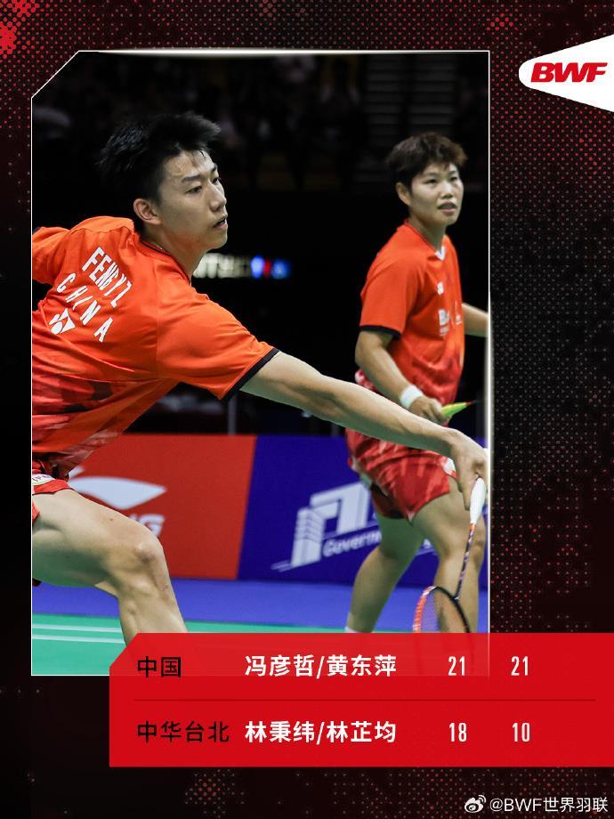 在混双首轮的一场比赛中,中国组合冯彦哲/黄东萍2-0打败中国台北组合林秉纬/林芷均晋级第二轮,两局比分为21-18、21-10。