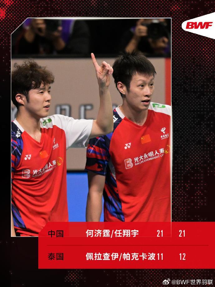 男双首轮,何济霆/任翔宇2-0打败泰国组合佩拉查伊/帕克卡波晋级第二轮,两局比分为21-11、21-12。