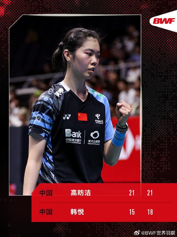 女单另外一场比赛中,高昉洁2-0驯服韩悦晋级第二轮,两局比分为21-15、21-18。